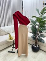 طقم سهرة أنيق ينساب القماش الفاخر بانسيابية ليمنحك إطلالة أنثوية متكاملة يمتزج الأحمر النبيذي الأنيق مع البيج الهادئ في تناغم يلفت الأنظار ويبرز جمالك في المناسبات الخاصة بكل تفرّد وأناقة.