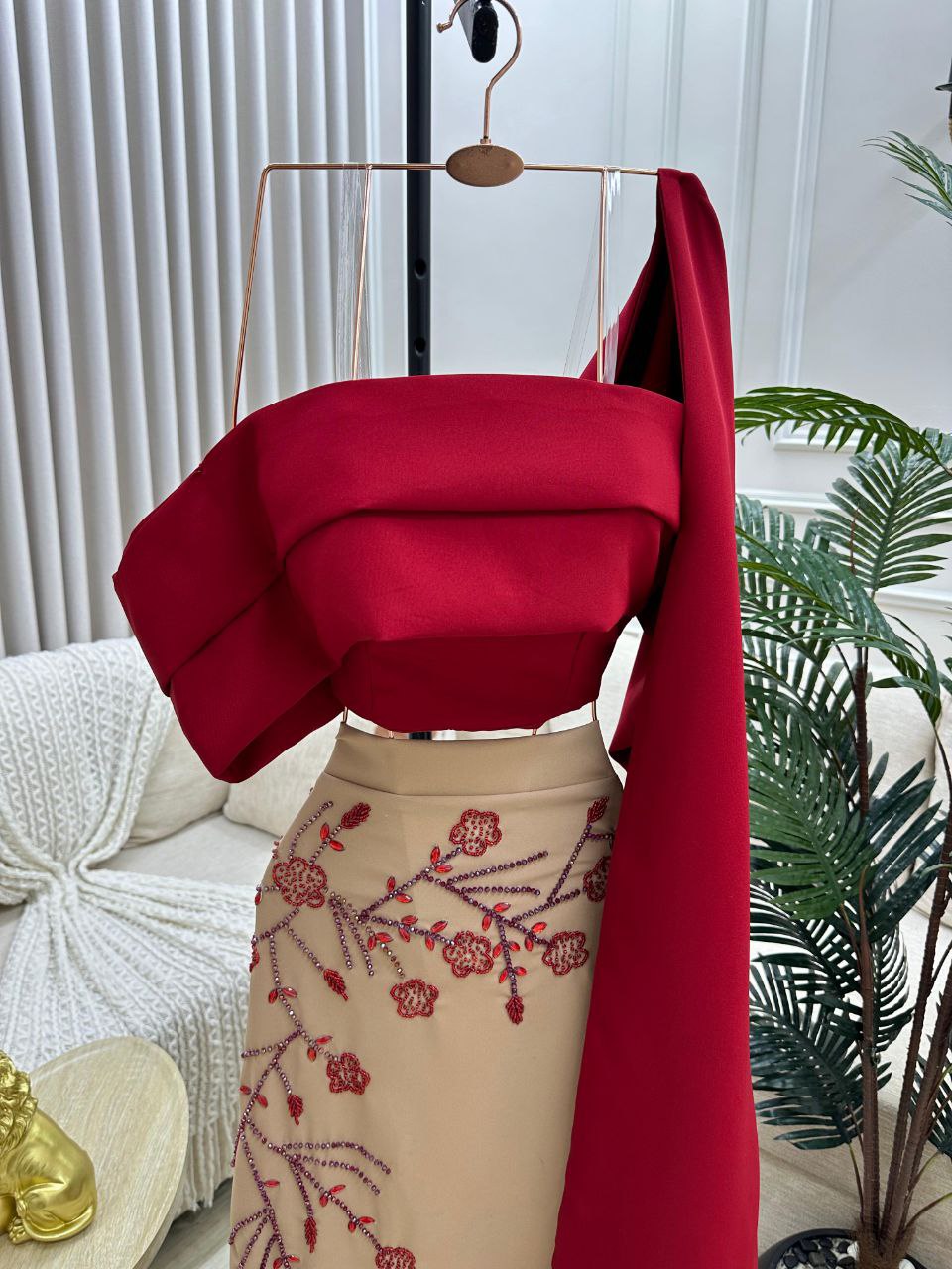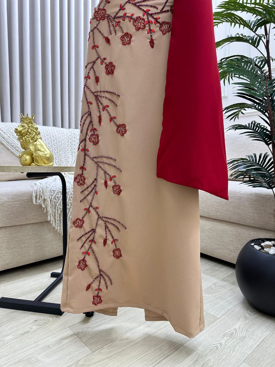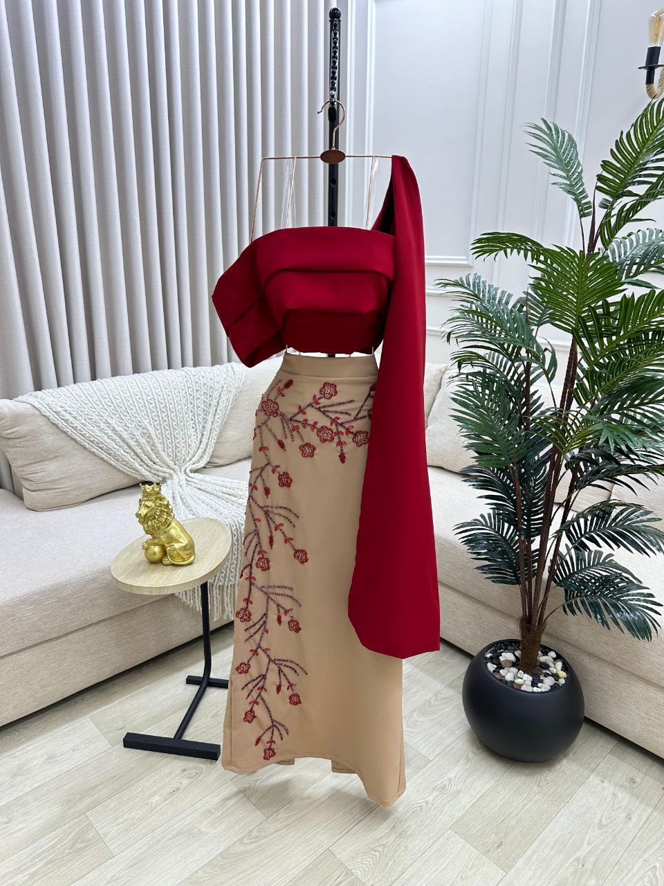 طقم سهرة أنيق ينساب القماش الفاخر بانسيابية ليمنحك إطلالة أنثوية متكاملة يمتزج الأحمر النبيذي الأنيق مع البيج الهادئ في تناغم يلفت الأنظار ويبرز جمالك في المناسبات الخاصة بكل تفرّد وأناقة.