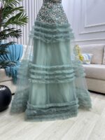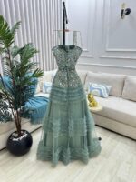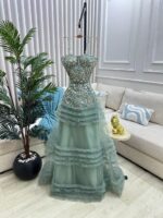 - الاسم: فستان سهرة باللون الأخضر الفستقي – تصميم حيوي