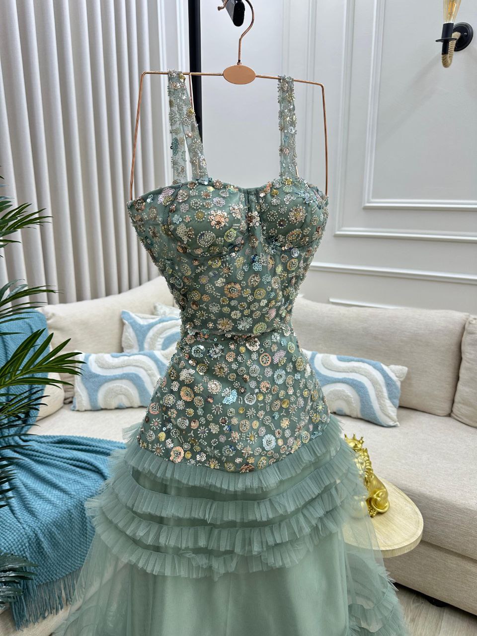 - الاسم: فستان سهرة باللون الأخضر الفستقي – تصميم حيوي