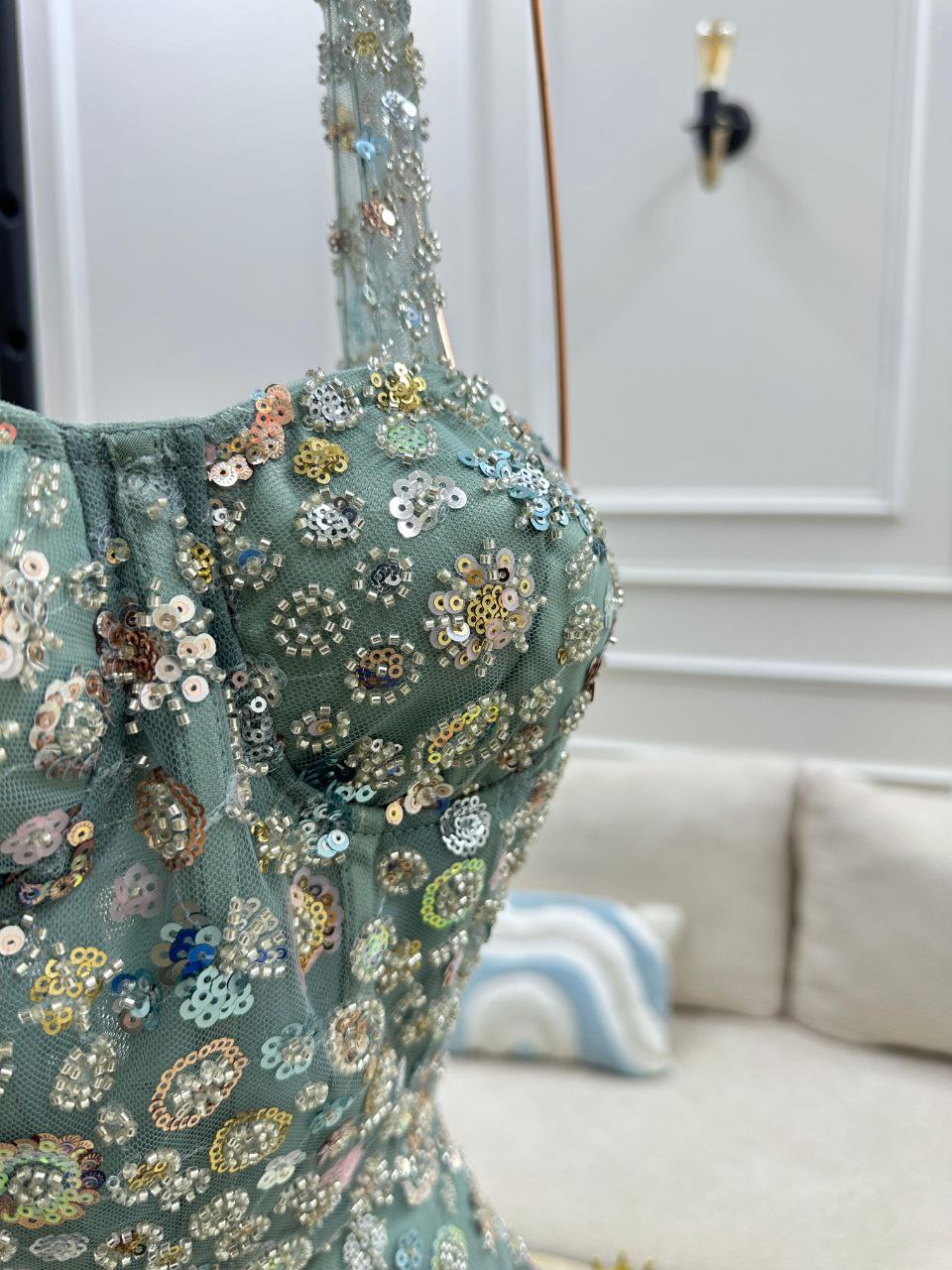 مواصفات فستان سهرة باللون الأخضر الفستقي