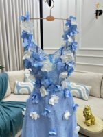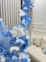 فستان سهرة باللون الأزرق السماوي المشرق، مزدان بزهور ثلاثية الأبعاد تمنحك مظهراً مفعماً بالأنوثة والجاذبية.تصميم زهور الربيع يبرز جمالك الطبيعي ويجعل حضورك مميزاً في أي مناسبة
