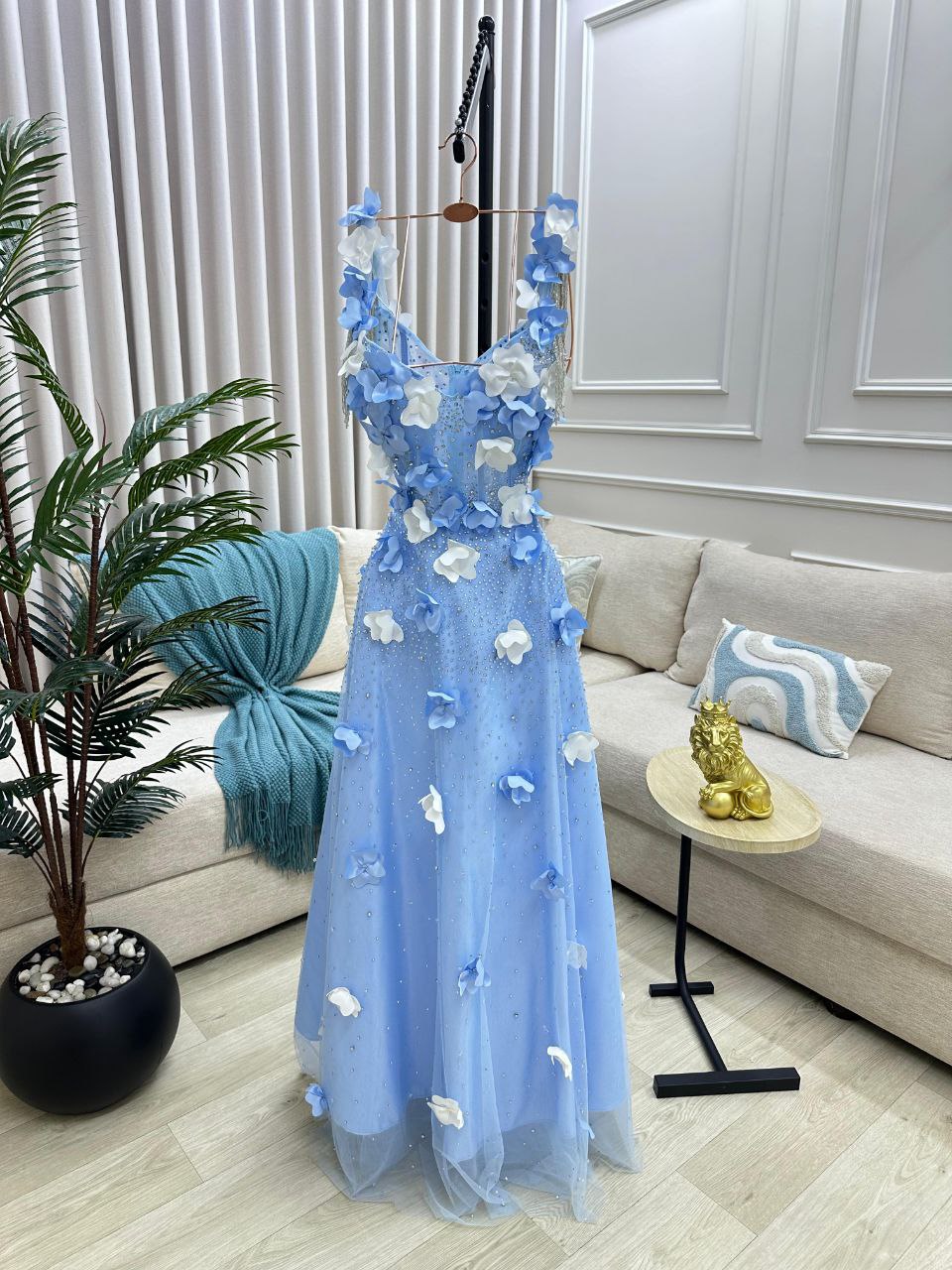 فستان سهرة باللون الأزرق السماوي المشرق، مزدان بزهور ثلاثية الأبعاد تمنحك مظهراً مفعماً بالأنوثة والجاذبية.تصميم زهور الربيع يبرز جمالك الطبيعي ويجعل حضورك مميزاً في أي مناسبة