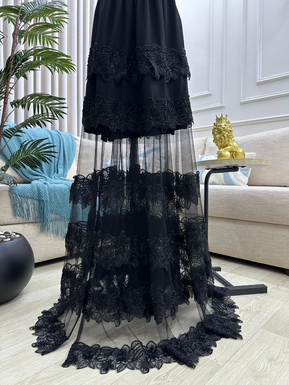 - الخامة: دانتيل فاخر مع قماش شفاف مطرّز
