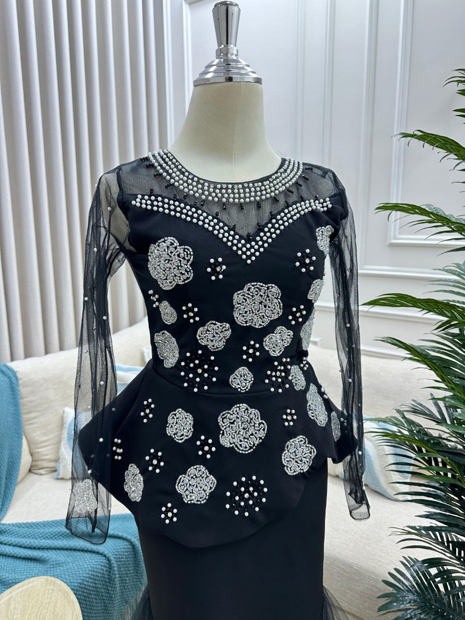 فستان سهرة أنيق باللون الأسود، يأتي بـ بتصميم مميز ومزين باللؤلؤ اللامع ليمنحك إطلالة ساحرة تجمع بين الرقي والجرأة. قصّة الفستان المميزة مع الأكمام الشفافة والتطريز المتقن تجعله خياراً مثالياً للظهور بأناقة مختلفة لا تُشبه أحداً.