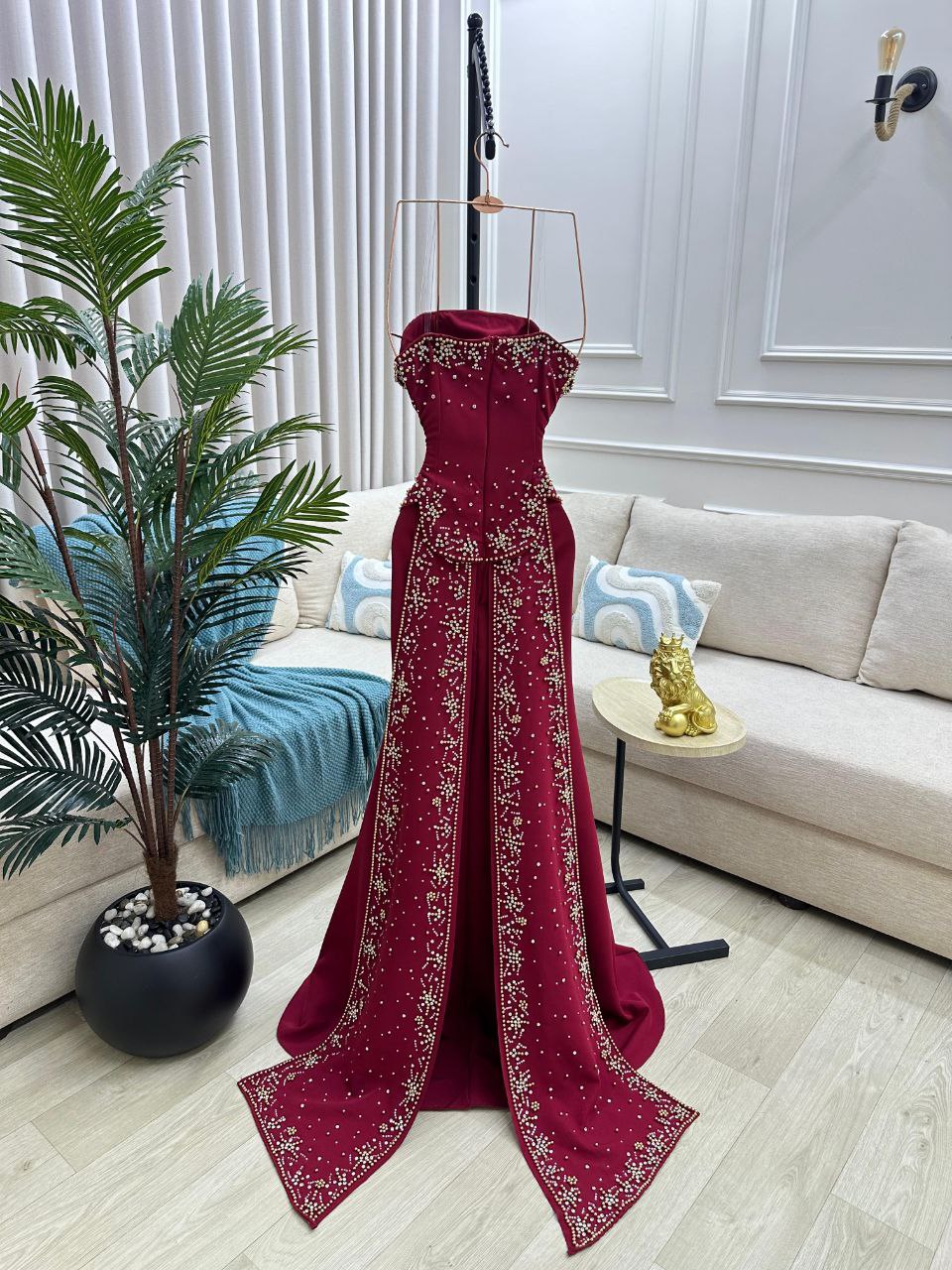 فستان سهرة باللون العنابي – إطلالة ملكية