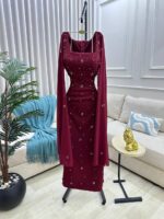 التطريز: يزين الفستان بالكامل تطريز دقيق من الخرز والترتر اللامع، مما يضفي عليه بريقاً خاصاً.