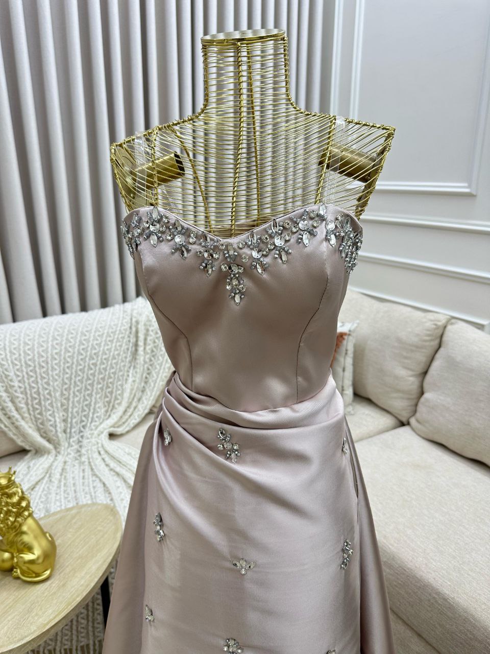 الوصف: تصميم فريد من نوعه يبرز جمال القوام ويزيد من تألقك. الفستان مزين بتطريزات كريستالية على الصدر، وقماش الدانتيل الأنيق يضفي عليه لمسة من الرقي. هذا الفستان مثالي لكل امرأة تبحث عن إطلالة ملكية ومميزة.